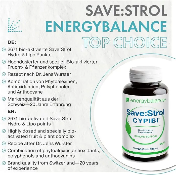 SaveStrol CYP1B1 ist ein natürlicher Wirkstoffkomplex mit durch Beta-Glucane aktivierten Phytoalexinen, Flavonoiden, Anthocyanen und Polyphenolen nach originaler Rezeptur von Dr. med. Jens Wurster. Hergestellt wird SaveStrol CYP1B1 vom Schweizer Qualitätsproduzenten EnergyBalance.Benötigen Sie 12 Dosen Save:Strol oder mehr, unterbreiten wir Ihnen gerne ein spezielles Angebot. Sprechen Sie uns gerne an.