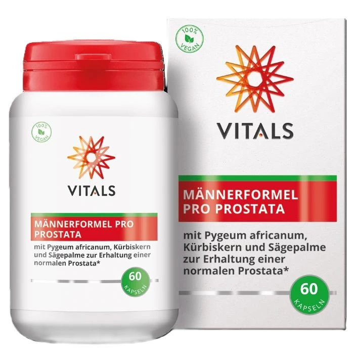 Pro Prostata - die Männerformel von Vitals - bietet Ihnen eine gezielt entwickelte Kombination aus hochwertigen Pflanzenextrakten. Mit Kürbiskern, Sägepalme und Pygeum unterstützen die Pro-Prostata Kapseln Ihre individuelle Versorgung. Zusätzlich enthält die Formel Beta-Sitosterol aus Kiefern, das synergistisch wirkt.So profitieren Sie von einer ausgewogenen Zusammensetzung, die die speziellen Bedürfnisse von Männern ab 40 Jahren erfüllt.