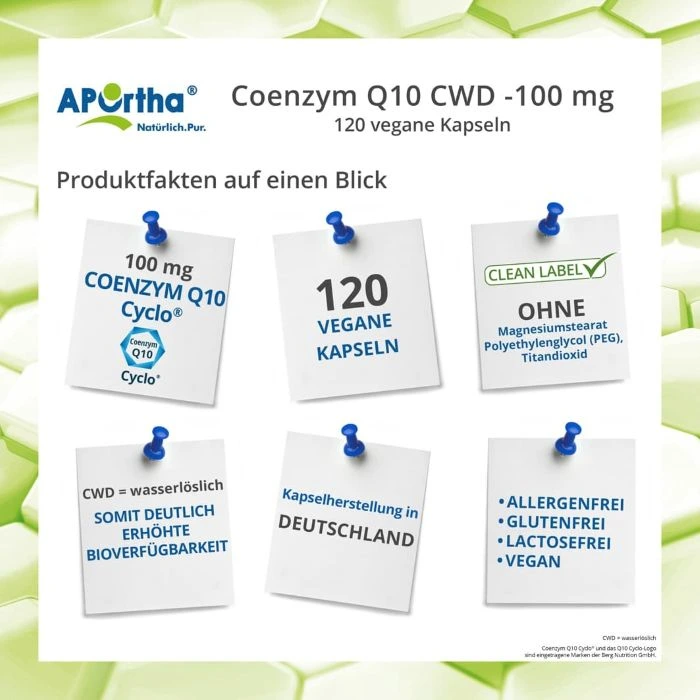Coenzym Q10 Cyclo® in pharmazeutischer Qualität entspricht veganen Ansprüchen und wird ohne Magnesiumstearat in Deutschland von Aportha hergestellt. Das Produkt ist soja-, gluten-, GVO- und laktosefrei.