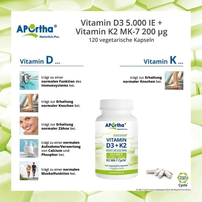 Vitamin K2 MK7 und Vitamin D3 5.000 I.E. sind in einer Kapsel vereinte, zwei sich ergänzende Wirkstoffe. Vitamin K2 MK7 und Vitamin D3-Kapseln sind vegetarisch, natürlich, allergenfrei und ausgezeichnet verträglich.